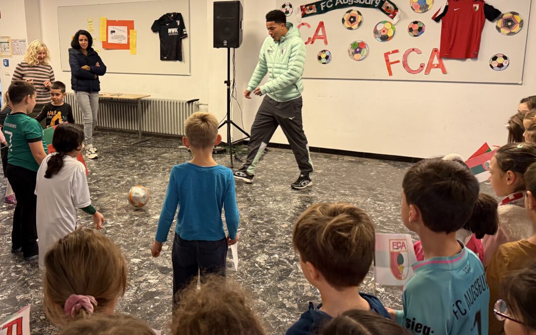 Am Dienstagmorgen riefen alle Erstklässlerinnen und Erstklässler im Chor „FCA! FCA! FCA!“ und schwenkten dabei gebastelte Fußball-Fahnen und hießen so den FCA-Profi Noahkai Banks willkommen.